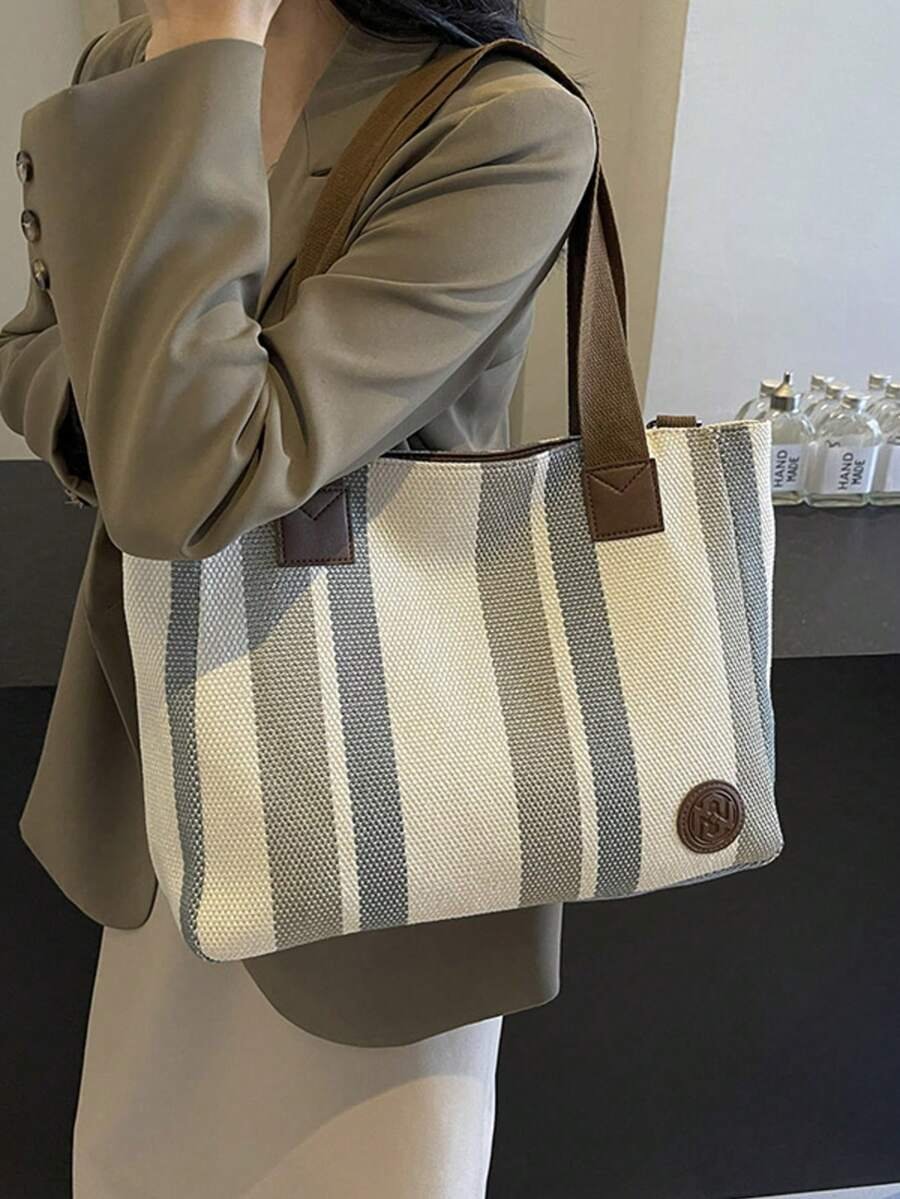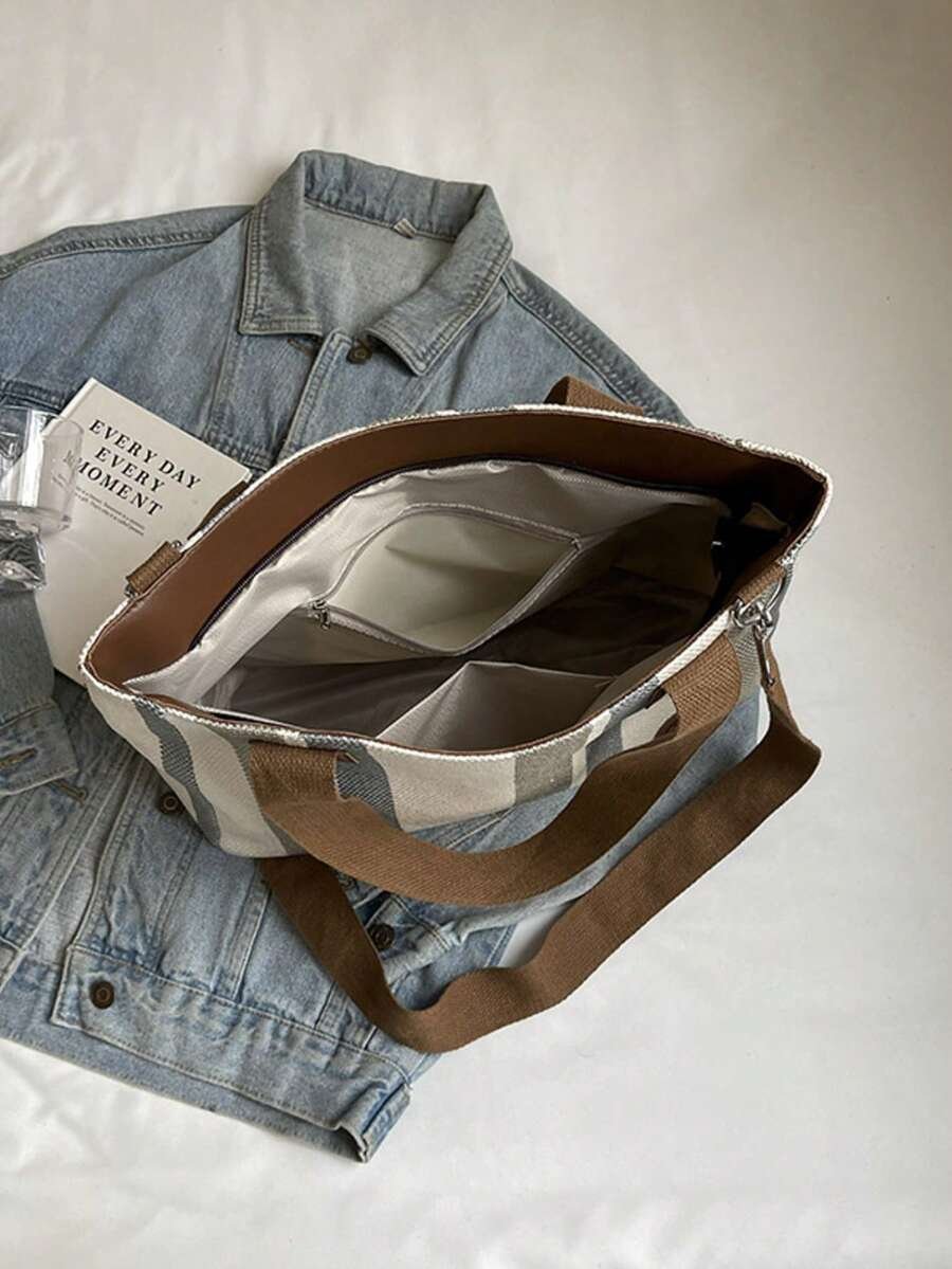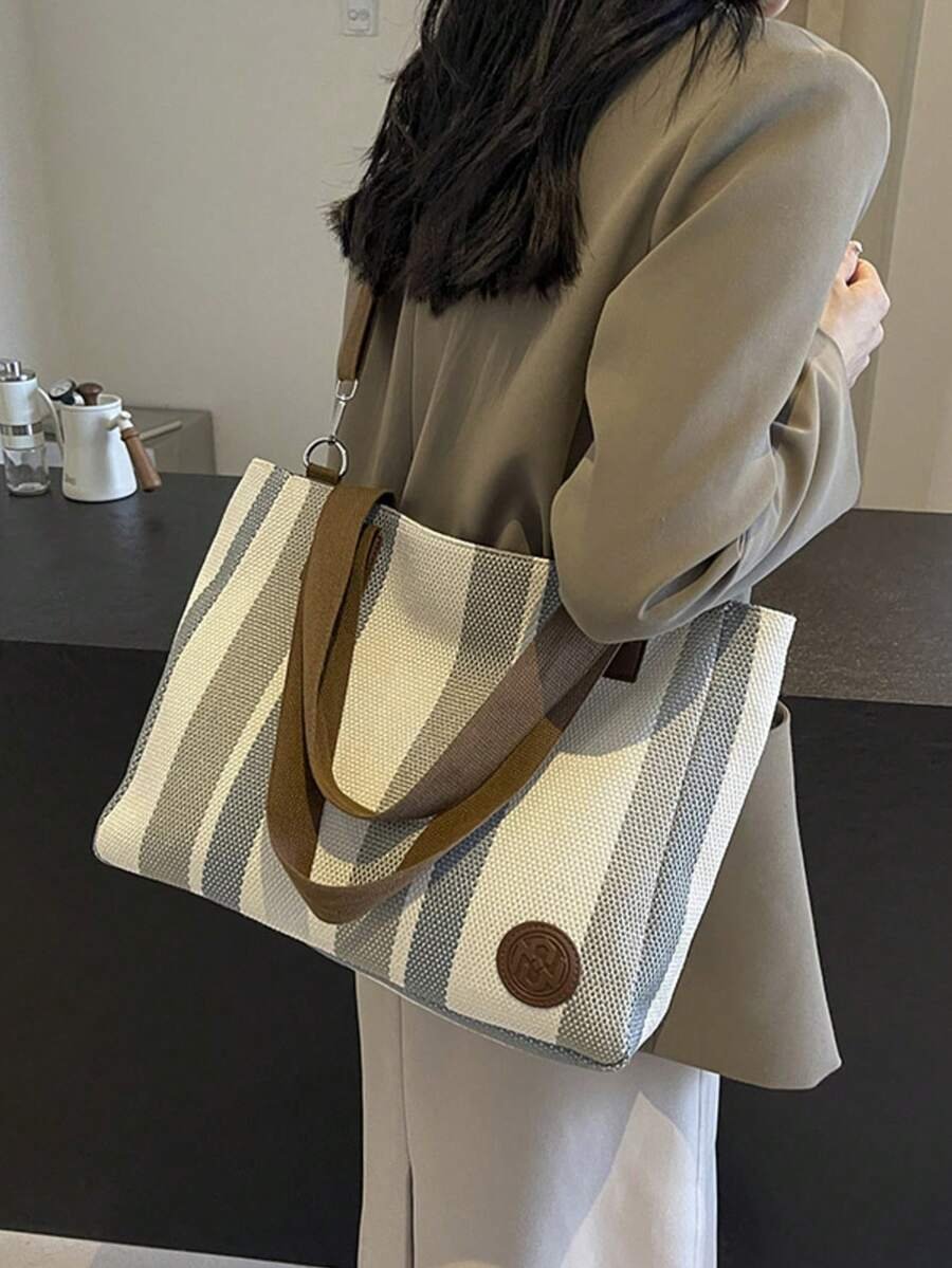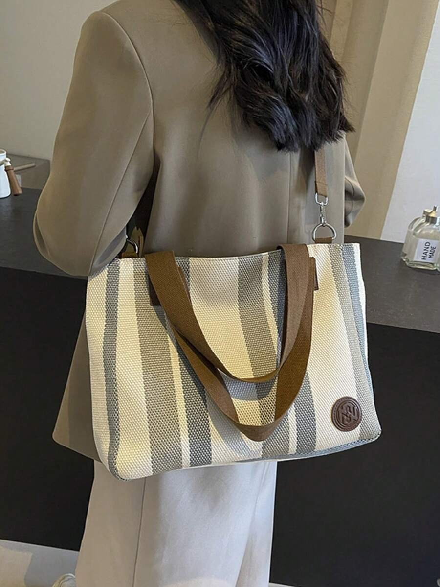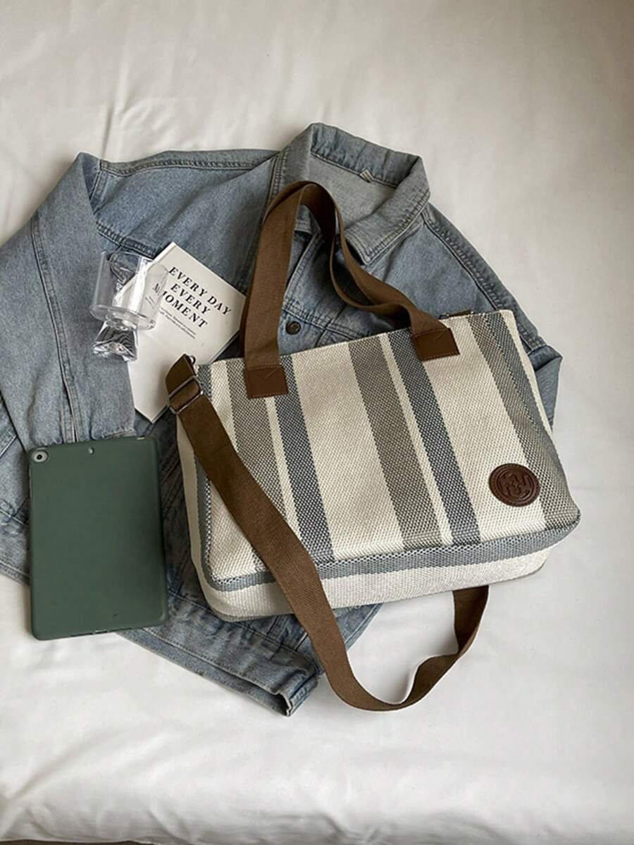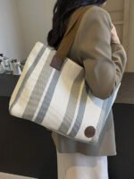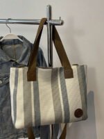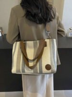 اختيارك لحقيبة الكتف بتصميم شرائطي قماش مخططة يعني اختيار الأناقة والعملية في آن واحد.