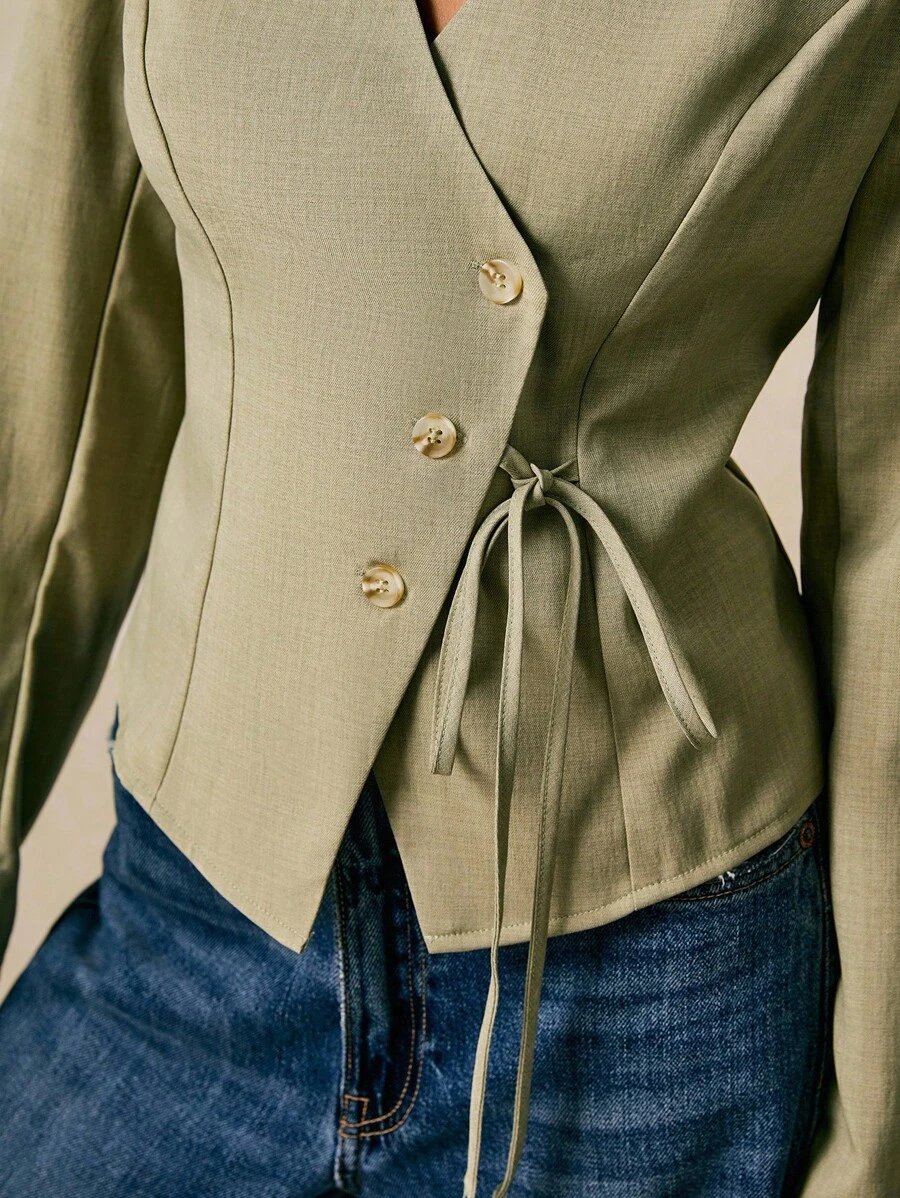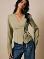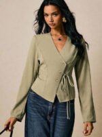 تألقي مع بلوزتنا النسائية الفريدة، المصممة لتجمع بين الأناقة والراحة. تمتاز هذه البلوزة بياقة مائلة بشكل V، مما يضفي لمسة جذابة وعصرية على مظهرك. تصميم الأكمام الطويلة يوفر لكِ الدفء والأناقة، بينما الرباط على الخصر يبرز جمال قوامك ويعزز أنوثتك. ومع الأزرار الأنيقة، تكتمل هذه القطعة، لتكون الخيار المثالي سواء للارتداء اليومي أو للمناسبات الخاصة.